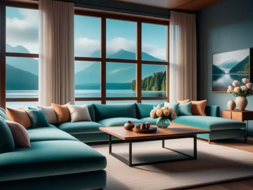 Espacioso salón con vista al lago rodeado de vegetación, decorado en tonos tierra y elementos de decoración para un hogar relajante