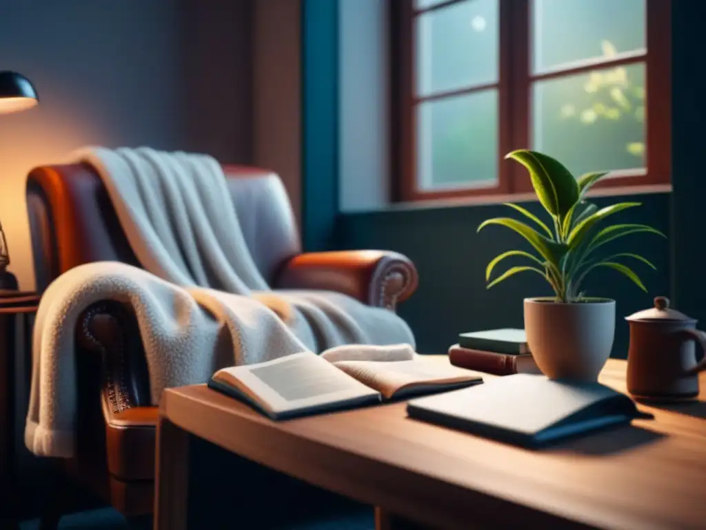 Un rincón acogedor para retiro relajación casa estudiantes con sillón, libros, planta y difusor de aceites esenciales